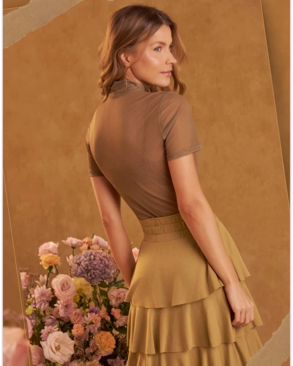 Esta blusa feminina em tule é perfeita para um visual elegante e moderno. Fabricada com materiais leves, oferece conforto e estilo. Ideal para diversas ocasiões, combina facilmente com saias e calças.