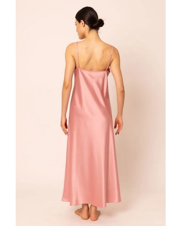 Esta camisola longa é um exemplo de sofisticação e conforto. Com um tom suave de rosa, ela é adornada com detalhes em renda no busto, proporcionando um toque romântico e elegante. Ideal para noites especiais ou para relaxar em grande estilo.